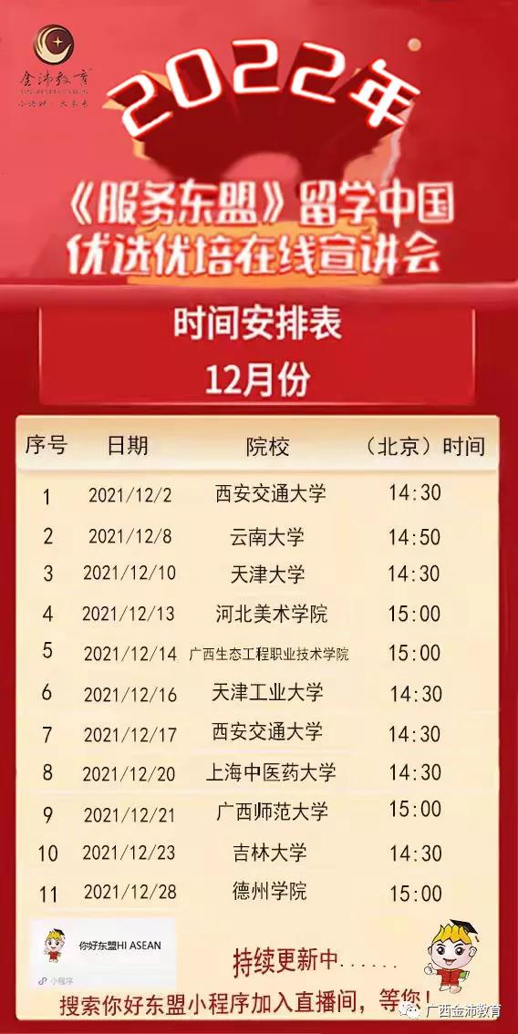 2021年12月2日起,由我司聯(lián)合多所高校開展的“2022年留學中國優(yōu)選優(yōu)培線上直播宣講會”將積極利用直播新形勢在“你好東盟”微信小程序上進行開播。學校和師生、家長可通過小程序你好東盟、Facebook和Youtube直播等多種途徑收看本次宣講會。