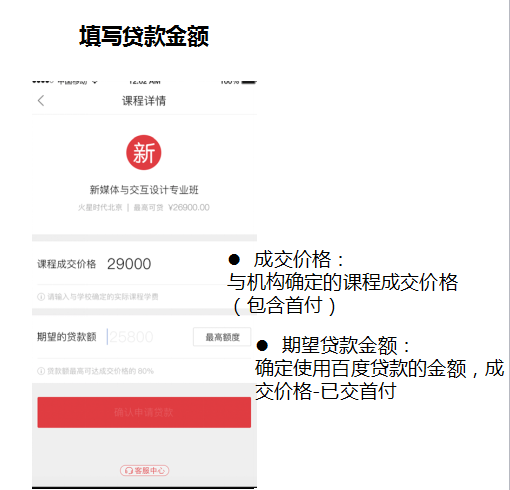 方式三:通過門店選定課程,填寫貸款金額【成交價(jià)格:與機(jī)構(gòu)確定的課程成交價(jià)格(包含首付);期望貸款金額:確定使用百度貸款的金額,成交價(jià)格-已交首付】