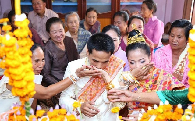 感恩儀式是婚禮上一項(xiàng)重要程序,過程也非常復(fù)雜,新郎新娘要感謝雙方父母養(yǎng)育之恩,雙方家長要宣講老撾的“十二風(fēng)”、“十四俗”,強(qiáng)調(diào)夫妻互敬之德,提醒雙方尊敬老人。