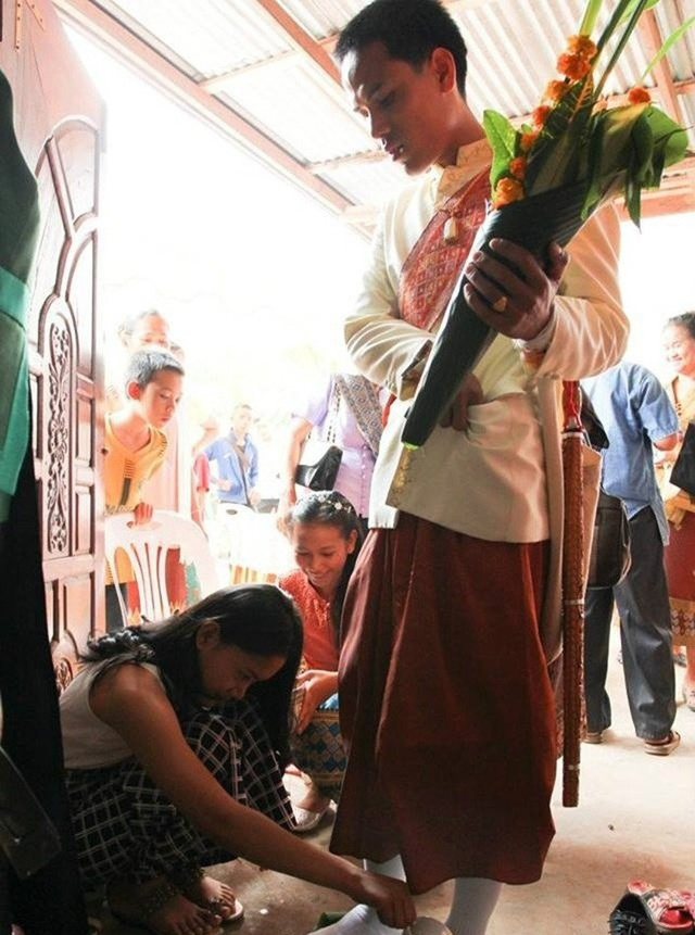 老撾婚禮中有一個(gè)很重要的儀式,老撾語稱“女婿游行”。即婚禮當(dāng)天,新郎按傳統(tǒng)風(fēng)格打扮,穿兜襠褲,配寶劍,手拿甘蔗和鮮花(象征保衛(wèi)愛情和創(chuàng)造甜蜜美好的新生活)前往新娘家。在距離新娘家還有一段距離時(shí),所有人必須下車,步行向新娘家走去。為體現(xiàn)男方家的誠意和身份,迎親隊(duì)伍會(huì)制造隆重?zé)崃业膱雒婧蜌夥?,一路敲鑼打鼓,鳴放鞭炮,載歌載舞。