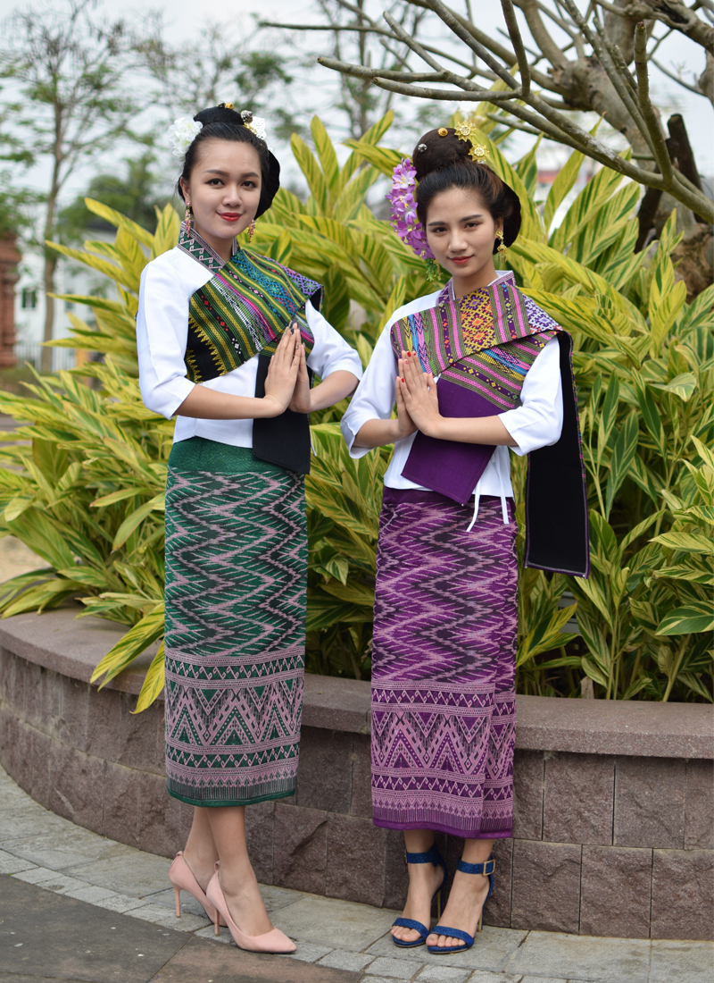老撾女士一般都有多套正裝行頭,面料看起來明顯出自于手工紡織。女士的正裝色彩斑斕,配上做工考究的民俗圖案和珠璉佩飾,給人一種質(zhì)樸、莊重的感覺。年輕女士的正裝顏色豐富,以鵝黃、桔橙、粉色、淡紫為主要色彩;中老年女士的正裝則青睞深紫、咖啡、墨綠、深藍(lán)等顏色。老撾人在集會時,一定會正裝出席,一改平日休閑、隨意的裝束。
