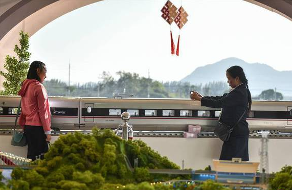 12月21日,在泰國東北部呵叻府巴沖縣,參觀者在中鐵鐵路合作項(xiàng)目一期工程開工儀式上與展出的中國復(fù)興號(hào)高鐵列車模型合影