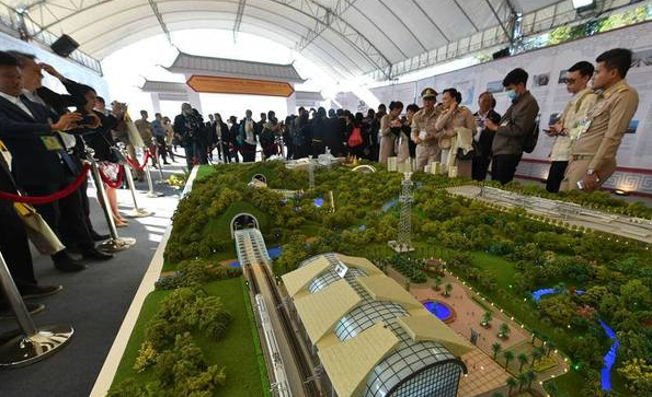 12月21日,在泰國東北部呵叻府巴沖縣,人們?cè)谥刑╄F路合作項(xiàng)目一期工程開工儀式上參觀項(xiàng)目沙盤模型。