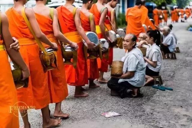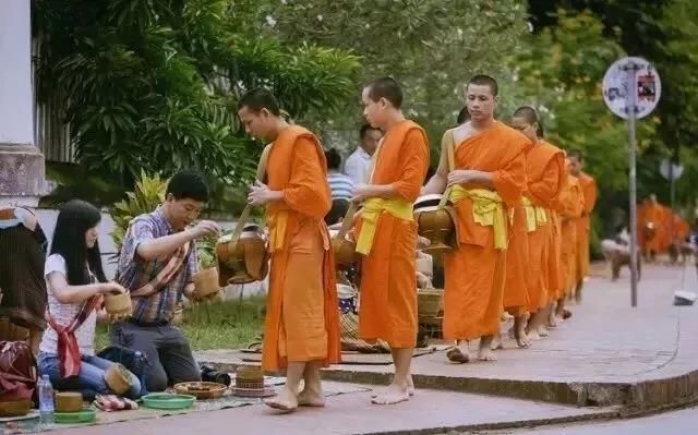 每天清晨六點(diǎn),一列列身穿黃色袈裟的僧人在寺廟住持的帶引下,赤腳圍著古城轉(zhuǎn)一圈,接受小城里人們的布施,然后駐足誦經(jīng)為他們祝福。