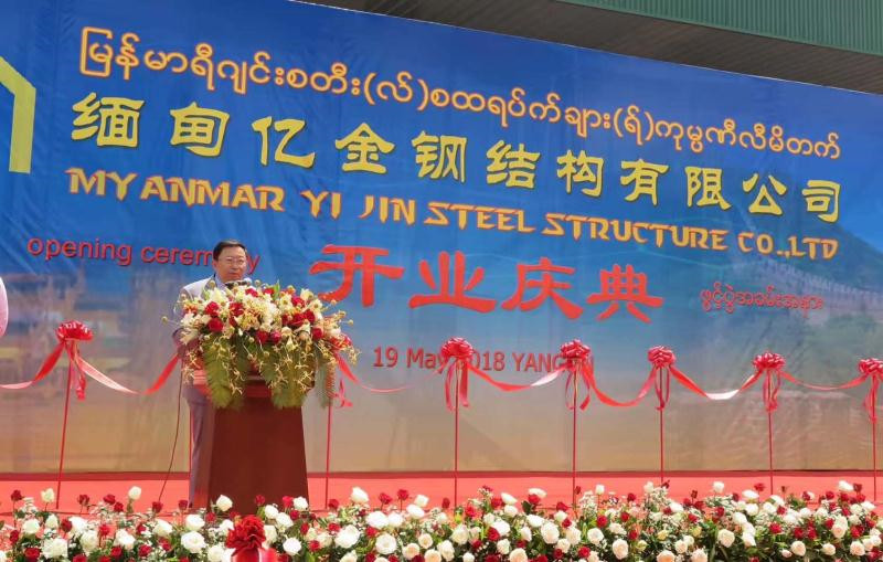 2018年仰光市,中國—東盟商務(wù)理事會執(zhí)行理事長許寧寧應(yīng)邀在緬甸億金鋼結(jié)構(gòu)公司開業(yè)盛典上致辭:中緬企業(yè)增進(jìn)合作、共同發(fā)展。該公司是中緬合資,是緬甸最大的鋼結(jié)構(gòu)加工和安裝企業(yè),承建了包括緬甸國家體育館、曼德勒商務(wù)與會議中心等多個標(biāo)志性建筑。